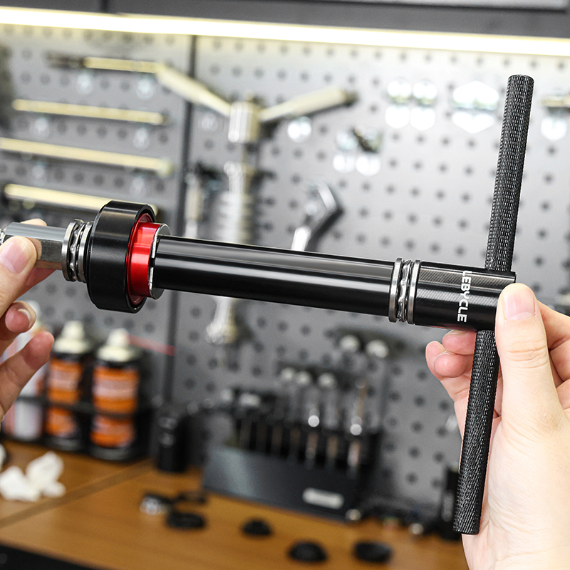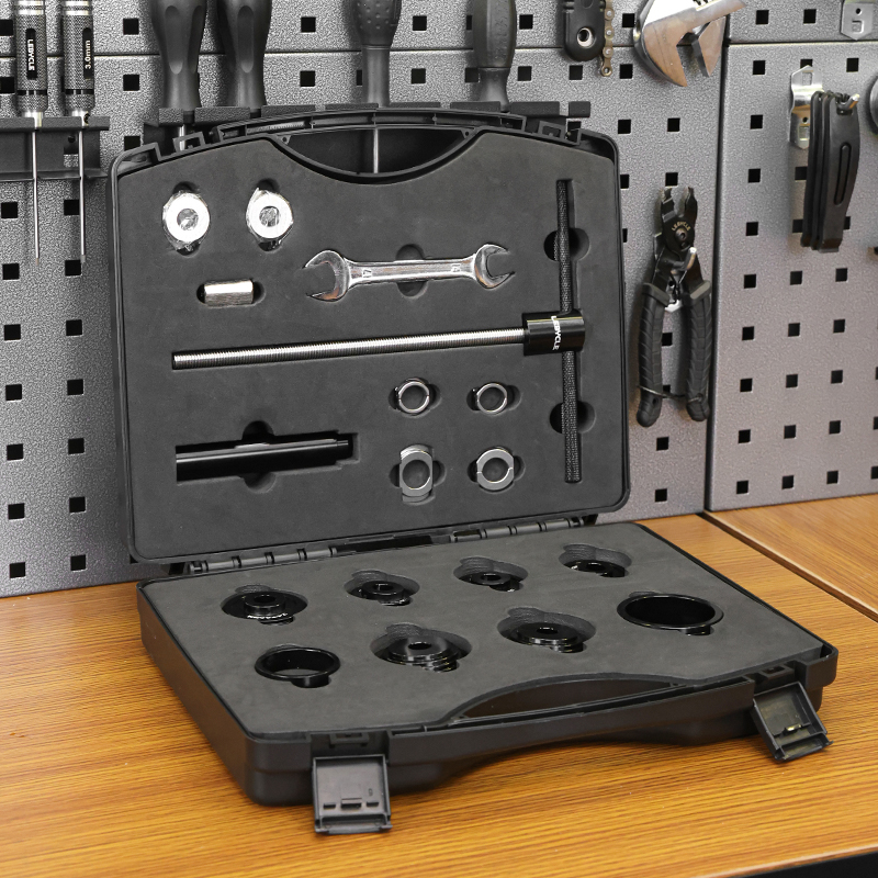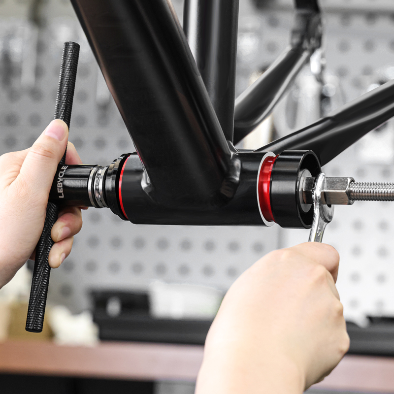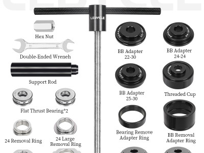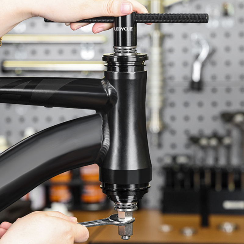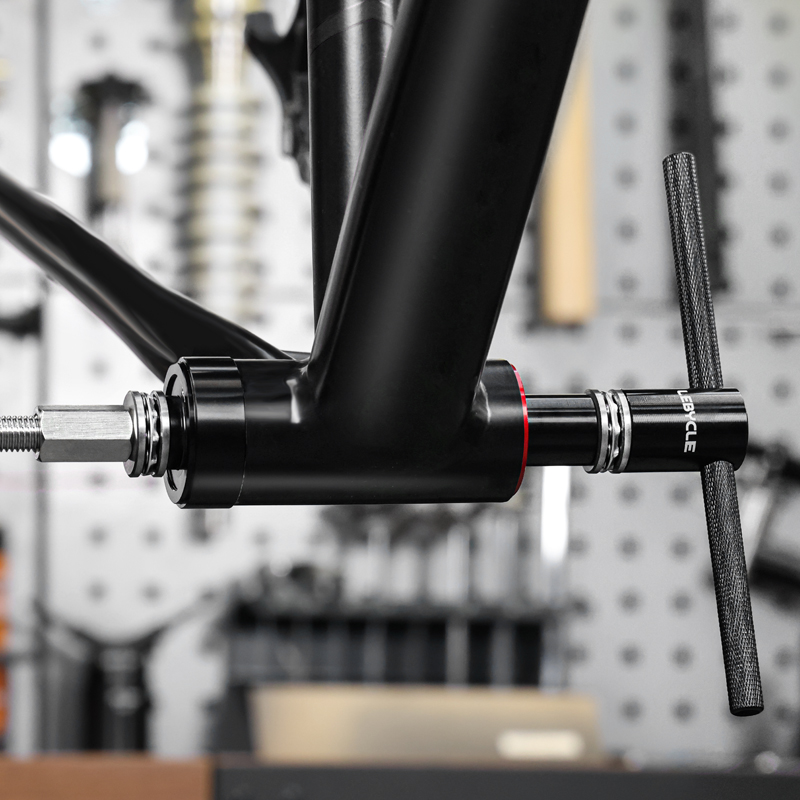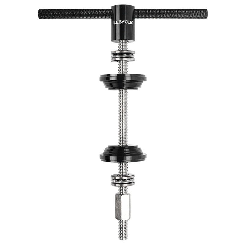 Пресс для каретки Lebycle TS-BBT-P01 Press-fit Bottom bracket tool. Инструмент для установки и снятия пресс-фит кареток (BB86, BB92, PF30 и других стандартов). Материал: анодированный алюминиевый сплав (рукоятка), CNC-обработанные адаптеры, оцинкованный винтовой стержень для долговечности. Подходит для установки кареток и гарнитур, обеспечивает точное и равномерное давление без повреждений. В комплекте адаптеры для различных размеров.