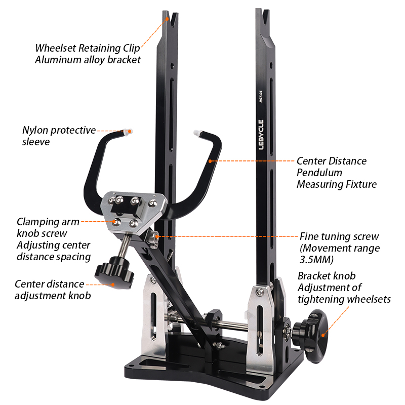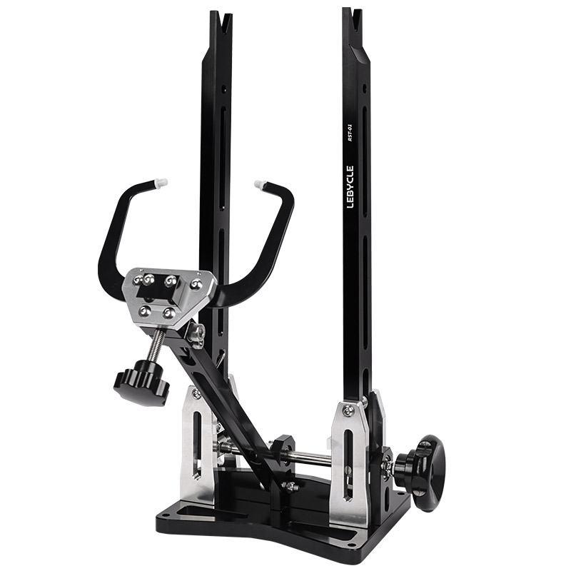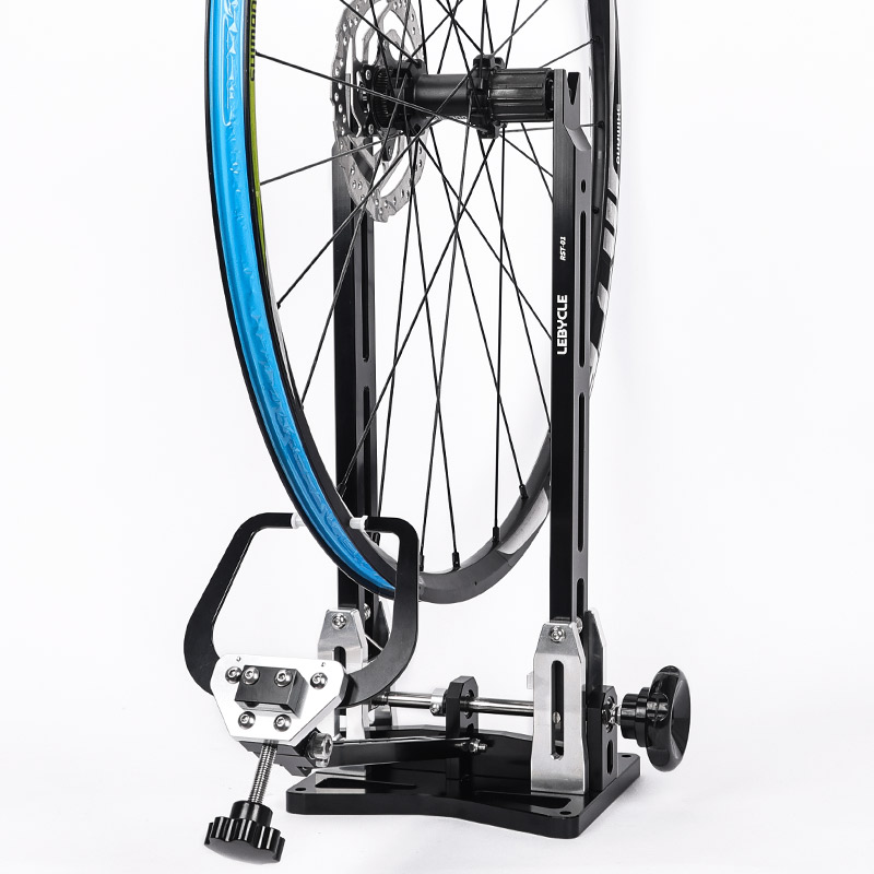 Станок для спицовки и правки колес LEBYCLE TS-RST-01. Изготовлен из высокопрочного алюминиевого сплава, разборная база для удобства хранения и транспортировки, плавная регулировка расстояния. Подходит для колес горных и шоссейных велосипедов, совместим с колесами от 16" до 29" дюймов, включая колеса с thru-axle (адаптеры в комплекте). Эргономичный дизайн, точная центровка обода и ступицы.
