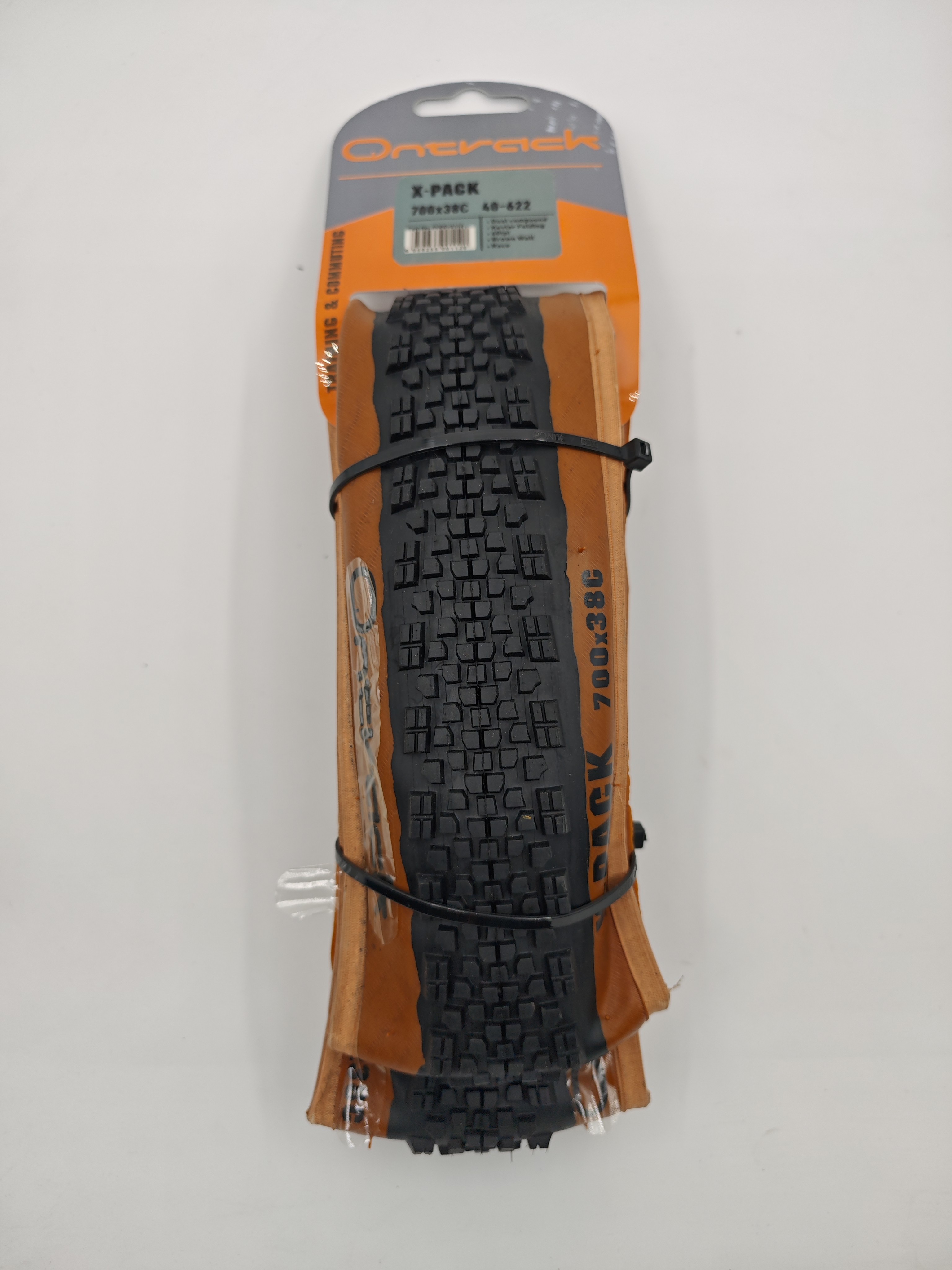 Покрышка для грэвел велосипеда ONTRACK, 700X38C. Кевларовое покрытие, 60 TPI. Вес 450 грамм. Цвет: черная с коричневыми боковинами.