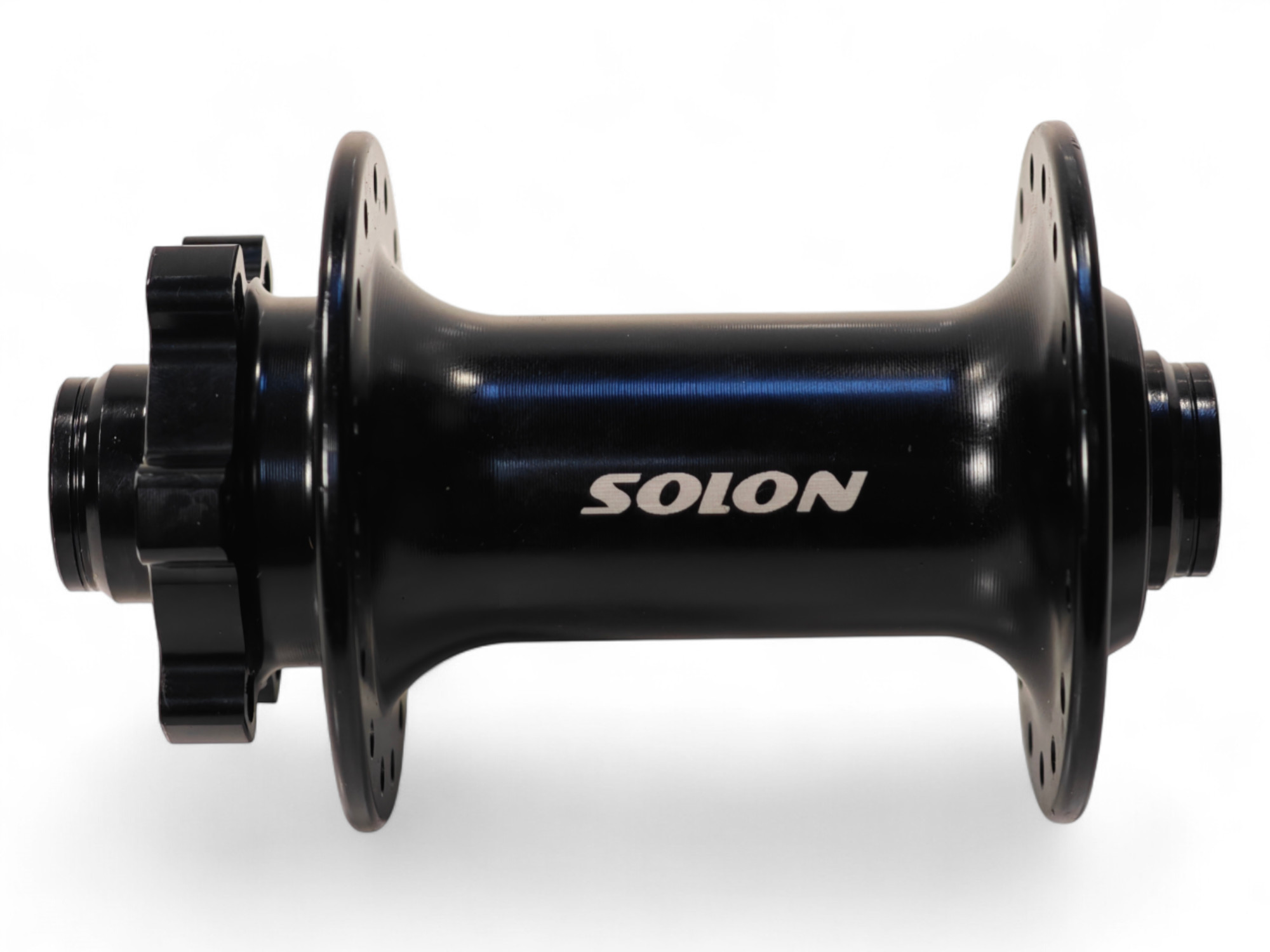 Передняя втулка под 6 болтов, 2 пром. подшипника, 14G*32H, 15*110 мм, анодированный черный с логотипом Solon (без сквозной оси)