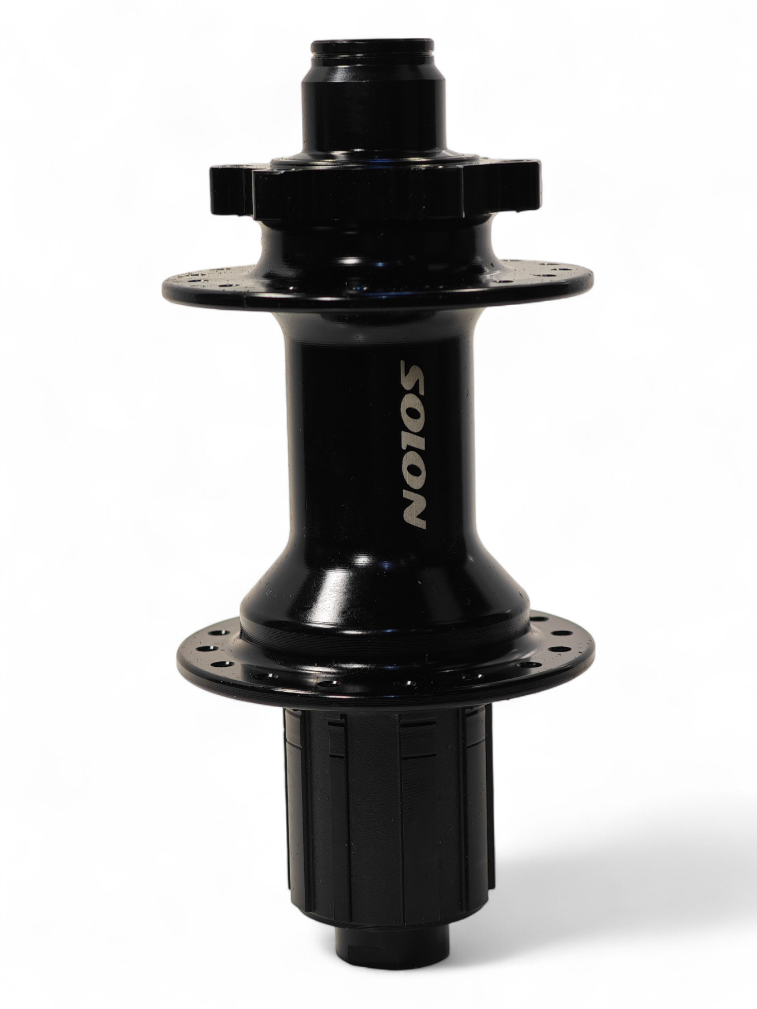 Задняя втулка под 6 болтов, 4 пром. подшипника, 14G*32H, 12*148 мм, анодированный черный под кассету HG и логотипом Solon