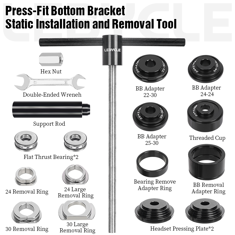 Пресс для каретки Lebycle TS-BBT-P01 Press-fit Bottom bracket tool. Инструмент для установки и снятия пресс-фит кареток (BB86, BB92, PF30 и других стандартов). Материал: анодированный алюминиевый сплав (рукоятка), CNC-обработанные адаптеры, оцинкованный винтовой стержень для долговечности. Подходит для установки кареток и гарнитур, обеспечивает точное и равномерное давление без повреждений. В комплекте адаптеры для различных размеров.