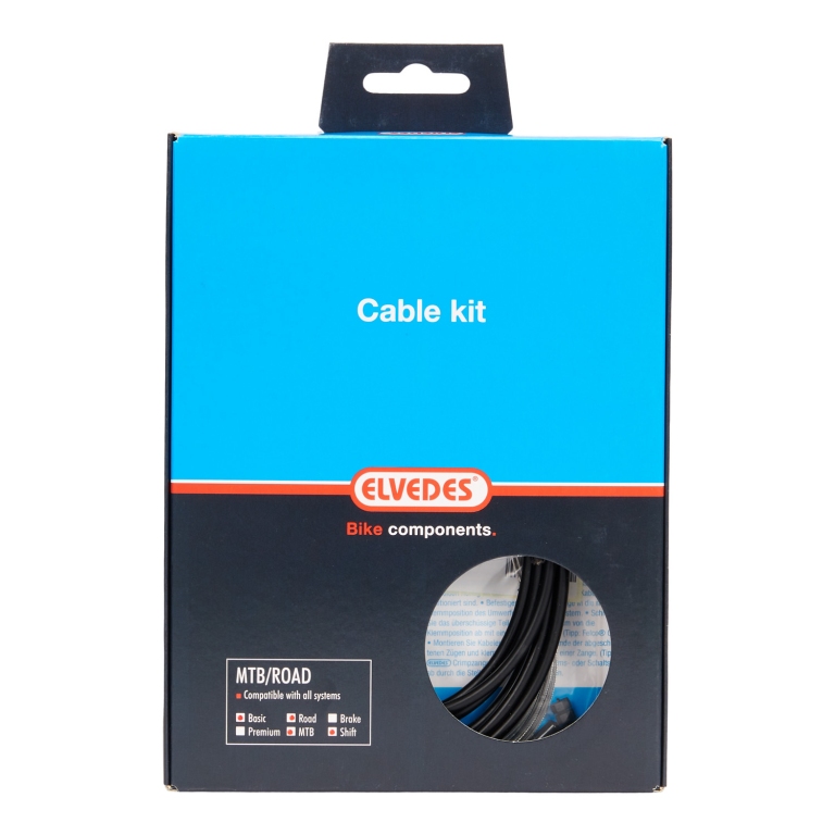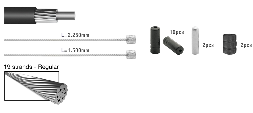 Набор для переключения Elvedes: 19 жильный оцинкованный трос переключения + оплетка, длина троса 1500 мм, оплетки 2250 мм. Внутренний диаметр оплетки 4.9 мм. В комплект входят: 10 колпачков для рубашки (ПВХ), 2 наконечника троса (алюминий), 2 о-ринга. Цвет: черный